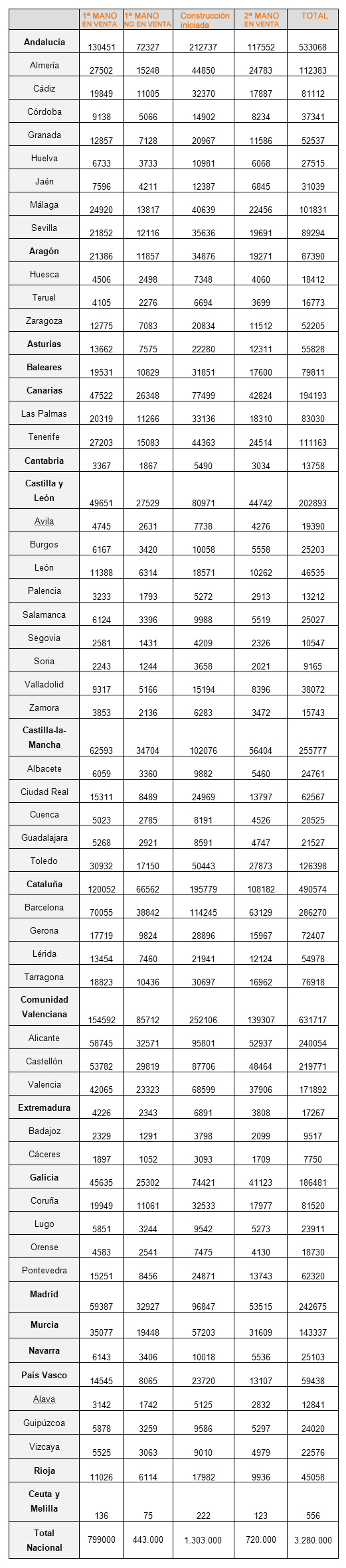 - Ministerio de Vivienda que, en el Informe sobre el stock de viviendas nuevas en 2010, hace una distribución de sus estimaciones de vivienda nueva provincia a provincia[1]; de esta forma podemos saber la distribución porcentual del conjunto de los pisos en cada una de las provincias del país.