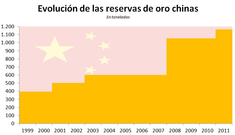 Durante las últimas décadas del siglo XX, la República Popular China mantuvo sus reservas de oro ligeramente por debajo de las 400 toneladas. En el año 2001, las aumentó a 500. Y al cabo de dos años, añadió otro centenar de toneladas. A finales de 2008, entró en el selecto grupo de países cuyas reservas superan las mil toneladas, junto a Suiza, Francia, Italia, Alemania y Estados Unidos.