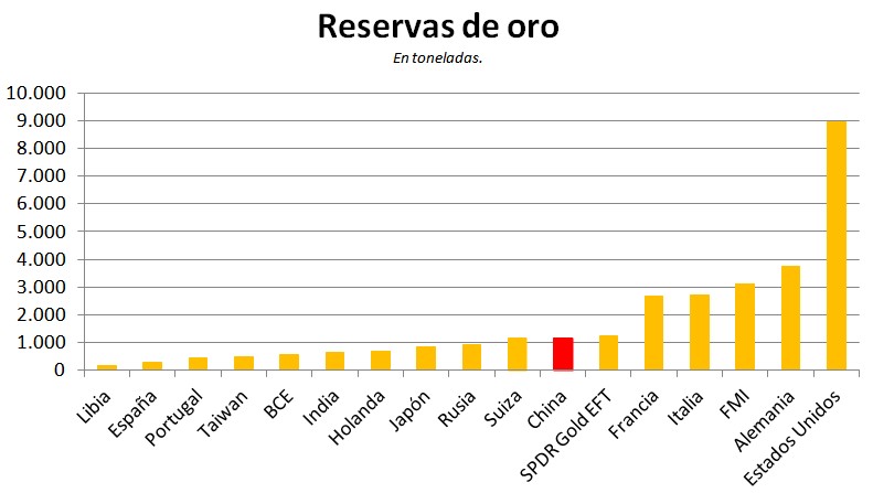 En el último lustro, China prácticamente ha duplicado sus reservas de oro, pasando de 600 toneladas en 2007 a las actuales 1161,1. Según Wikileaks, se trata de una política diseñada específicamente para destronar al dólar como la divisa de reserva internacional y, simultáneamente, favorecer la internacionalización de la "divisa del pueblo", el renminbi chino.