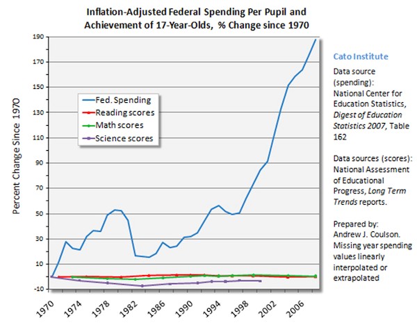 La primera idea a tener en cuenta es que mayores niveles de gasto en educación no garantizan ni mucho menos mejores resultados. Un caso prototípico de esto es el de Estados Unidos. Como puede verse en el gráfico, el creciente gasto gubernamental por alumno en educación no ha evitado que el rendimiento educativo de los estadounidenses haya permanecido prácticamente estancado en las últimas décadas.