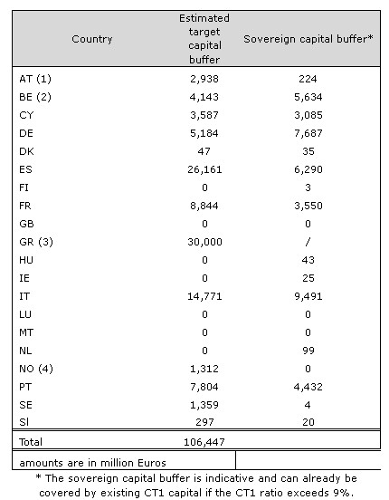 España es el segundo país con mayores necesidades de recapitalización (26.161 millones de euros), sólo por detrás de Grecia (30.000 millones). Los bancos italianos necesitarán 15.000 millones de euros, mientras que las necesidades de capital de Alemania ascienden a 5.100 millones y las de Francia a 8.800 millones. De este modo, bancos españoles y griegos acaparan casi el 53% de las nuevas necesidades de capital de los grandes bancos europeos.