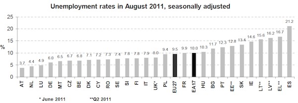 Grecia, después de dos años de una profunda crisis, ha visto cómo se deterioraba su mercado laboral. El 9,5% de paro de 2009 se ha convertido en un 16,7% en el verano de este año. Aún así, sigue a cinco puntos del 21,5% publicado este viernes por el INE.