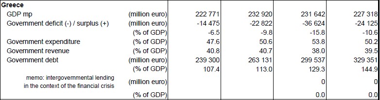 1. Según los últimos datos de Eurostat, la oficina estadística de Bruselas, el PIB de Grecia fue de 227.328 millones de euros en 2010; su déficit ascendió al 10,6% del PIB (24.125 millones); y su deuda pública del 144,9% (329.351 millones).