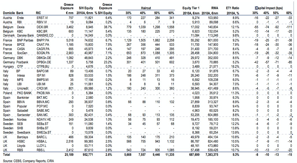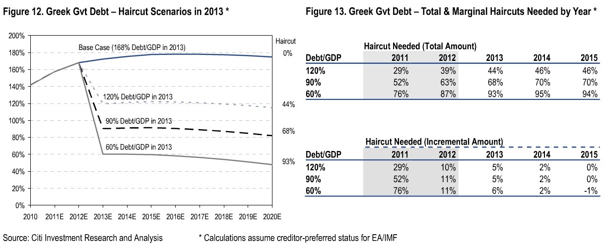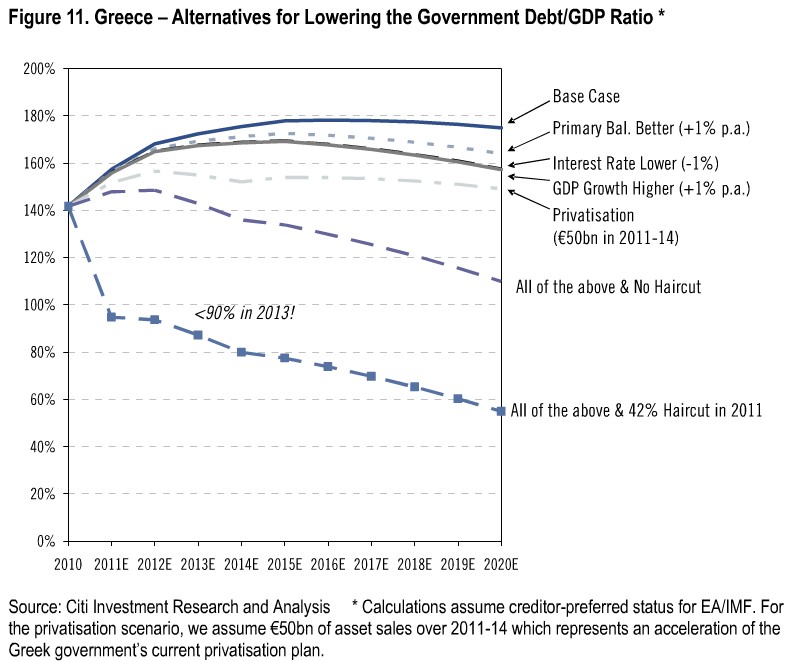 Por su parte, el banco norteamericano Citi estimaba ya en abril que Grecia debería reducir su deuda a un máximo del 90% del PIB en 2013 para recuperar la confianza de los inversores a medio plazo. Para ello, sería necesario aplicar una quita del 42%, pero su economía tendría que empezar a crecer de inmediato, el Estado tendría que registrar superávit, los costes financieros se tendrían que mantener bajos con ayuda exterior y Atenas tendría que completar la privatización de activos para recaudar 50.000 millones de euros hasta 2014.