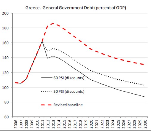 - En caso de no aplicar quita, la deuda de Atenas ascendería al 186% en 2013, al 152% en 2020 y al 130% en 2030 y, además, Grecia no podría volver a financiarse en los mercados de deuda hasta 2021.