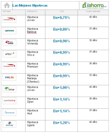 Las ofertas de hipotecas cambian a peor de forma frenética. Hace apenas unos días Unoe pasó de ofrecer un Euribor + 0,69 a un Euribor + 0,95 y SelfBank dejó de ofertar su Euribor + 0,75. Con tanto cambio, y teniendo en cuenta que el ranking puede variar de un día para el otro, tenemos en la cima de las mejores hipotecas a Bancopopular-e, con un Euribor + 0,79 si no superas los 35 años de edad.