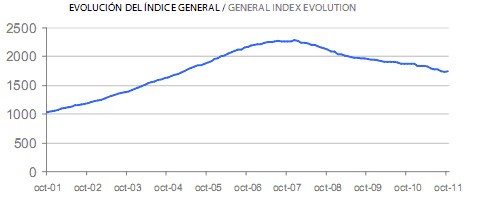 Según el informe de Tinsa, la multinacional líder del análisis del mercado inmobiliario que ha analizado idealista.com, el precio de la vivienda en España continúa su senda descendente, aunque a menor ritmo. En el mes de octubre bajó un 6,9% la tasa interanual, frente al 7,4% del mes anterior desde máximos, en diciembre de 2007, el precio de las casas ha bajado un 23,7%.