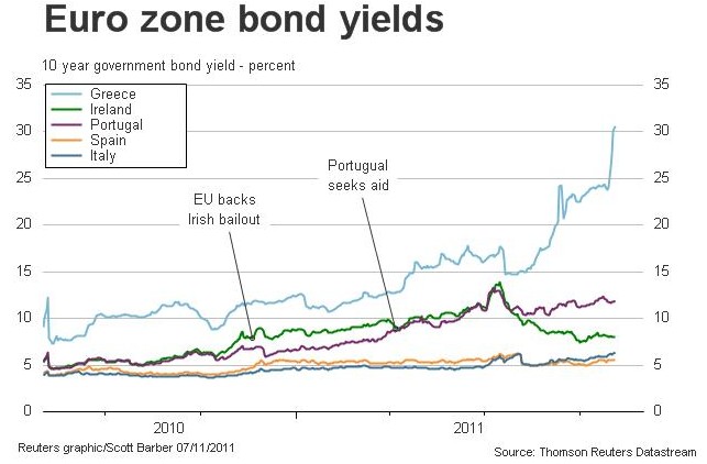 Grecia, Irlanda y Portugal recurrieron al rescate internacional después de que la rentabilidad de sus bonos a 10 años superase la barrera del 7%. Desde entonces, la situación ha mejorado algo en Irlanda, pero las primas de riesgo (diferencial con el bono alemán a 10 años) de Grecia y Portugal han seguido aumentando debido a la ausencia de mejoras significativas en sus cuentas públicas y variables económicas.