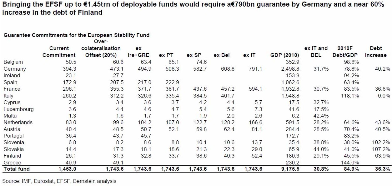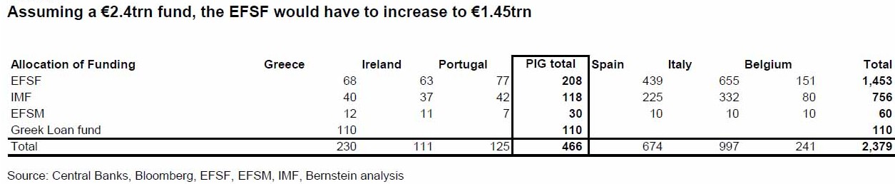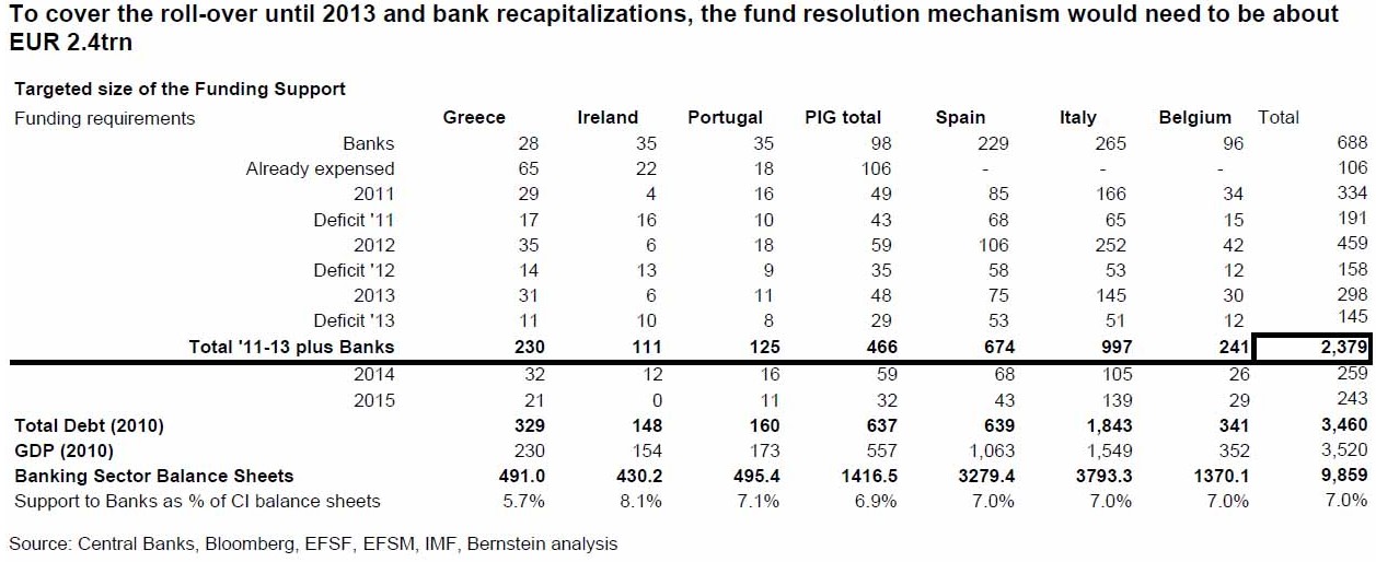 El EFSF carece, hoy por hoy, de artillería suficiente -poco más de 250.000 millones de euros disponibles- para mantener en pie a los periféricos y, al mismo tiempo, recapitalizar a los bancos. Basta con observar las necesidades de refinanciación de estados (vencimientos de deuda y pago de intereses) y recapitalización de bancos hasta 2013: Grecia, Irlanda, Portugal, España, Italia y Bélgica precisan cerca de 2,4 billones de euros, según un informe de Bernstein del pasado verano, una cuantía muy cercana a la que barajan los líderes europeos para reforzar el Fondo (unos 2 billones).