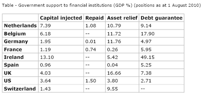En quinto lugar, las intervenciones públicas, tanto directas (inyecciones de capital) como indirectas (garantías), han sido muy superiores fuera de España. De acuerdo a datos de 2010 publicados en un artículo de enero de este año por el Banco Central de Holanda, el volumen total de intervenciones en España (sobre PIB) era el menor de una muestra que incluía otros ocho países (Holanda, Bélgica, Alemania, Francia, Irlanda, Reino Unido, EEUU y Suiza).