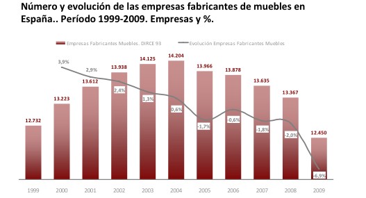En el año 2008 experimentó un descenso del -2%, durante el ejercicio 2009 el decrecimiento llevó al cierre a 917 empresas de fabricantes de muebles.