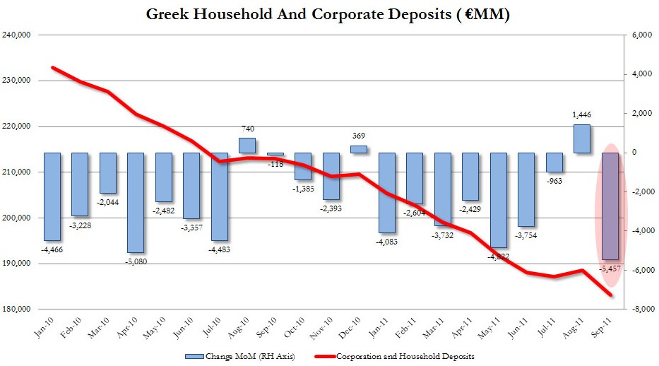 El miedo a perder sus depósitos se disparó a partir de julio, debido a la incertidumbre acerca de la puesta en marcha del segundo plan de rescate, sin el cual Grecia podría verse condenada a salir del euro, tal y como alertaron Berlín y París tras el referéndum anunciado por el primer ministro griego, Yorgos Papandréu. La crisis, tanto política como económica, ha alcanzado tintes dramáticos tras las insistentes reticencias de Atenas para poner en marcha las condiciones (ajustes y reformas) que exige la denominada troika (Bruselas, FMI y BCE) para seguir prestando dinero al país. Por el momento, la concesión del sexto tramo de ayuda internacional pactado en mayo de 2010 -unos 8.000 millones de euros- tendrá que esperar hasta mediados del próximo diciembre, tras sufrir sucesivos retrasos respecto a la fecha programada inicialmente (octubre).