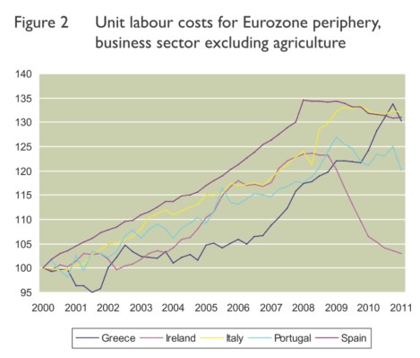 Quizás haya pocos gráficos que ilustren mejor esta realidad que el siguiente, sobre costes laborales en los PIIGS. En Grecia, España, Italia o Portugal, los costes no han hecho sino crecer, al tiempo que la productividad se desplomaba (incluso en mitad de la crisis, apenas ha habido mejoras en este aspecto), debido a su rigidez en la legislación laboral, que obliga a las empresas a hacer los ajustes en forma de despidos y no de salarios.
