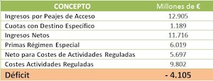 El Gobierno fija unos peajes de acceso que le permitirán recaudar casi 13.000 millones de euros. Con ese dinero tiene que pagar las cuotas con destino específico (el operador del mercado, el operador de la red eléctrica o la moratoria nuclear). Esto le deja unos 11.700 millones de euros netos. Con ese dinero se pagan las subvenciones al régimen especial que el Gobierno ha estimado en 6.000 millones de euros. Esto le dejaría unos 5.700 millones para pagar el resto de cosas que hay que pagar. Sin embargo, el propio Gobierno estima que este resto de cosas le va a costar 9.800 millones de euros, con lo cual aparecen más de 4.100 millones de déficit de tarifa eléctrico.