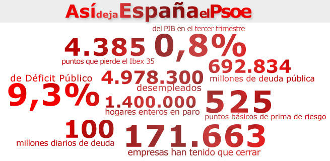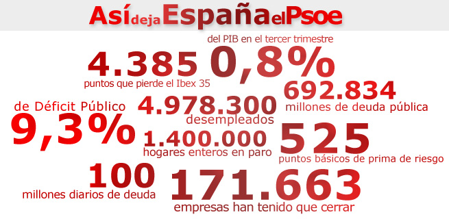 Estas son sólo algunas de las magnitudes macroeconómicas que ayudan a comprender la gestión económica del Ejecutivo saliente. Son las cifras que hablan de una España en crisis y al borde de la intervención económica. Unas cifras que invitan, sin duda, a la reflexión.