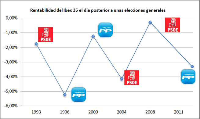 Los datos son los datos. Desde que el IBEX 35 existe, siempre ha arrojado rentabilidades negativas el día posterior a unas elecciones generales. Vamos, que la resaca postelectoral nunca le ha sentado demasiado bien a nuestro índice nacional.