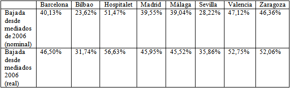 - La bajada en términos nominales en la grandes ciudades españolas ya ronda el 39,5%, y el 45,9% en términos reales (mercado de segunda mano, precio de compra-venta efectiva).