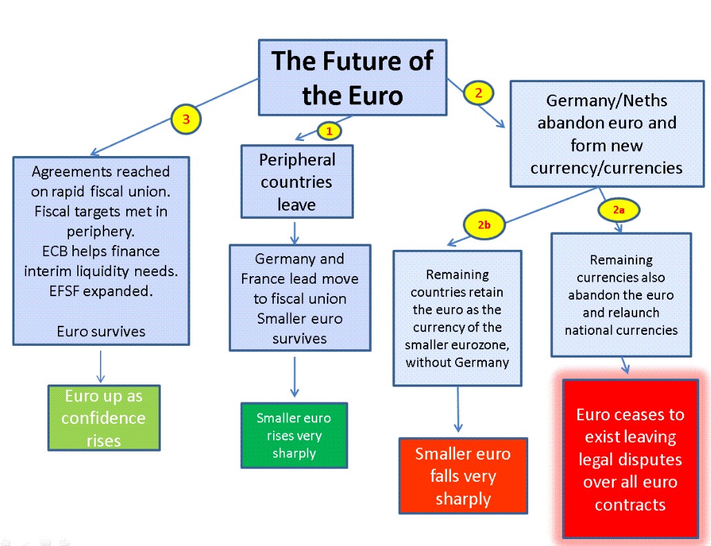 A partir de aquí, todos los escenarios que se barajan en la actualidad supondrían la ruptura de la actual zona euro, de uno u otro modo. En concreto, el segundo escenario consistiría en la salida de uno o varios países periféricos.