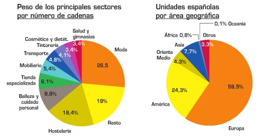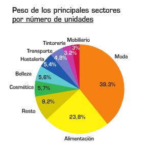 Por sectores y por número de unidades vendidas, la moda sigue siendo clave en el modelo exportador de estas franquicias. Las firmas de ropa made in spain tienen un peso del 39,3%. La segunda posición por volumen de ventas es para el sector de la alimentación, con un 23,8% del total, no es de extrañar teniendo en cuenta que la cadena española de franquicias DIA ocupa la primera posición entre las cadenas españolas con más establecimientos en el extranjero. DIA nació en España en 1979 con la apertura de su primera tienda en Madrid presentando en nuestro país un concepto nuevo hasta esa época, el formato "descuento". Desde 1989, en el que comienza a explotar el modelo de negocio de franquicia, DIA ha abierto tiendas alrederor de toda Europa. En el año 2000 cierra un importante movimiento de carácter global que culmina con la integración del Grupo DIA en el Grupo Internacional Carrefour.
