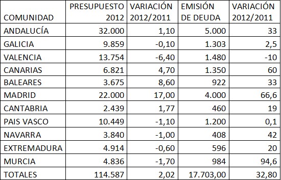 Como se ve, en 2012 gastarán una media de algo más del 2% respecto a 2011, y en cuanto a las emisiones de deuda el importe será casi una tercera parte mayor que toda la deuda emitida a lo largo del presente ejercicio.
