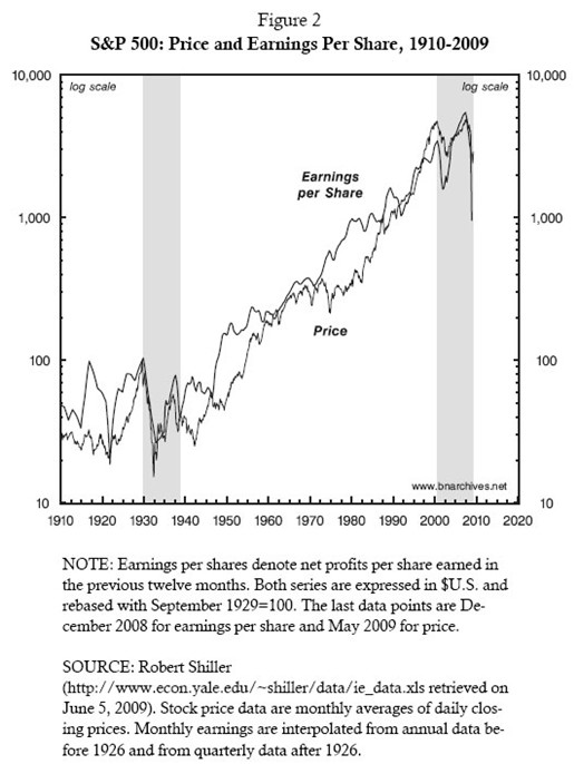 El gráfico anterior nos muestra la correlación que existe entre ganancias por acción y cotización a lo largo de los años. Vemos, sin embargo, que las dos series se separan y, no por casualidad, en épocas en que la fase del ciclo económico estaba haciendo estragos, ya sea cuando hacen acto de presencia las burbujas económicas ya sea cuando lo hacen las crisis y recesiones. Obsérvese que las desviaciones a la baja de los años 70 produjeron una infravaloración bursátil que propició casi dos décadas posteriores de subidas. Ocurre lo inverso en el caso de la segunda mitad de la década de los 90, donde las cotizaciones se despegan significativamente de las ganancias dando lugar a un mercado bajista subsiguiente.