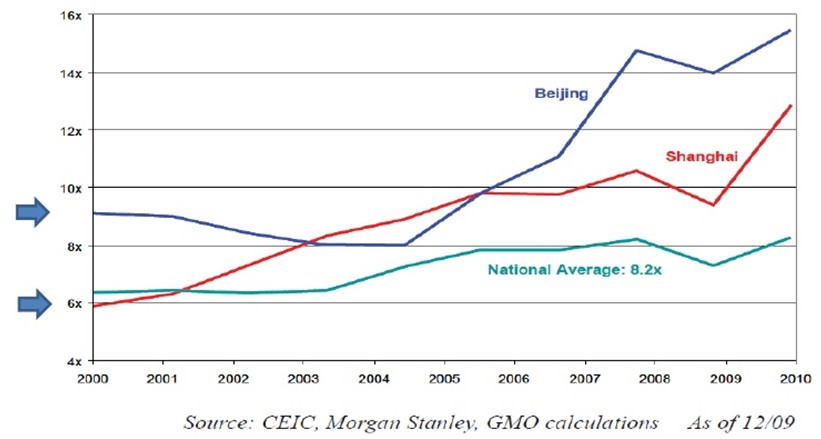 Y ello, por dos razones: en primer lugar, piensan que el tamaño de la burbuja está a veces sobrevalorado debido a que, aunque los precios de la vivienda subieron mucho, también lo hicieron los ingresos de los chinos. Si bien esto es cierto, indicadores que tienen en cuenta este hecho también dan una imagen preocupante (ver gráficos siguientes); y, en segundo lugar, porque las condiciones de las hipotecas concedidas han sido relativamente restrictivas mediante la exigencia de entrada y garantías considerables.