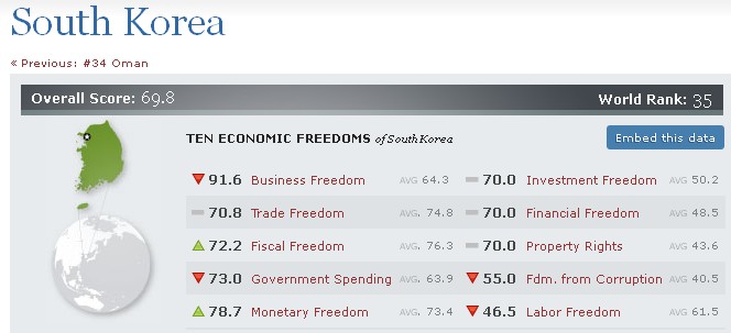 Por su parte, el Índice de Libertad de la Heritage Foundation lo sitúa en el puesto 35 en 2011, con una nota global de 69,8 puntos, por encima de la media mundial (59,7), siendo además el octavo país más libre de la región Asia-Pacífico. Su fuerte, nuevamente, es su grado de libertad comercial, tanto a nivel interno como externo, alcanzando una puntuación de 91,6 puntos (sobre un total de 100) y 70,8, respectivamente.