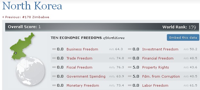 La Heritage Foundation sitúa dicho régimen en el último puesto de su ranking (179), justo por detrás de Zimbabwe y Cuba (también comunistas), siendo, por tanto, el país menos libre del planeta. Su puntuación es 0 (el mínimo) en casi todas las materias analizadas. Mantiene una férrea planificación socialista en todas las ramas de actividad, siendo el Estado el propietario de los recursos productivos. La propiedad privada brilla por su ausencia y la actividad empresarial es una utopía, penada con la muerte y la cárcel.