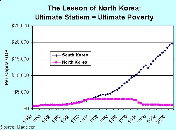 La particular historia de la pequeña península de Corea ofrece una inigualable, al tiempo que triste, experiencia real sobre economía, ya que en un mismo territorio han convivido dos modelos antagónicos, pared con pared, durante más de 60 años. La península, que fue anexionada por Japón a principios del siglo XX, fue dividida en dos zonas al término de la II Guerra Mundial. La parte norte fue ocupada por los soviéticos y la sur por EEUU, conformándose así dos estados independientes que han terminado por configurar mundos diametralmente opuestos.