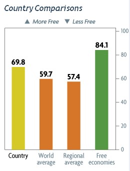 Por su parte, el Índice de Libertad de la Heritage Foundation lo sitúa en el puesto 35 en 2011, con una nota global de 69,8 puntos, por encima de la media mundial (59,7), siendo además el octavo país más libre de la región Asia-Pacífico. Su fuerte, nuevamente, es su grado de libertad comercial, tanto a nivel interno como externo, alcanzando una puntuación de 91,6 puntos (sobre un total de 100) y 70,8, respectivamente.