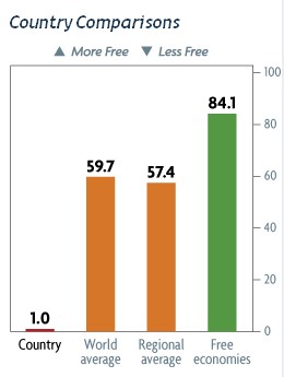 La Heritage Foundation sitúa dicho régimen en el último puesto de su ranking (179), justo por detrás de Zimbabwe y Cuba (también comunistas), siendo, por tanto, el país menos libre del planeta. Su puntuación es 0 (el mínimo) en casi todas las materias analizadas. Mantiene una férrea planificación socialista en todas las ramas de actividad, siendo el Estado el propietario de los recursos productivos. La propiedad privada brilla por su ausencia y la actividad empresarial es una utopía, penada con la muerte y la cárcel.