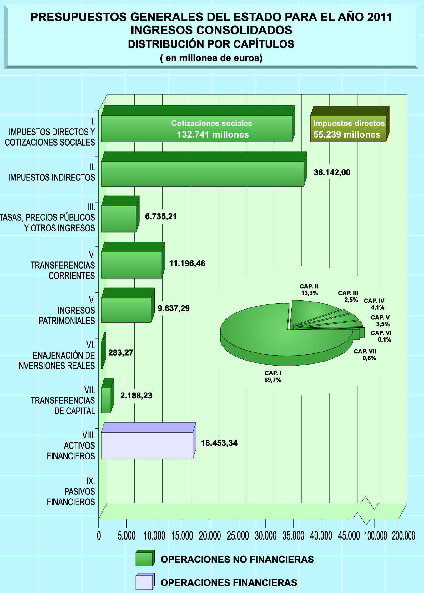 En el siguiente gráfico puede verse el reparto de los ingresos del Estado por partidas. Como vemos, la gran mayoría, casi el 70%, viene de cotizaciones sociales e impuestos directos (IRPF y Sociedades fundamentalmente). Evidentemente, estas partidas dependen muy mucho de la actividad económica: cualquier desaceleración podría incluso hacer que bajasen las predicciones del Gobierno, lo que haría la situación aún más complicada.
