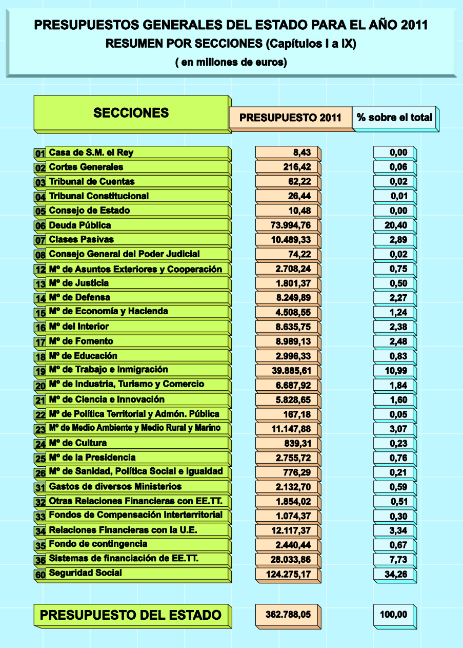 Entre estas partidas destacan por su magnitud el sistema de financiación de autonomías y ayuntamientos con 28.033 millones, las relaciones financieras con la UE (12.117 millones), el Ministerio de Agricultura (11.148 millones), Fomento (8.989 millones), Interior (8.635 millones) y Defensa (8.249 millones). Si no ocurre nada raro, de ellos tendrá que salir el grueso del ahorro.