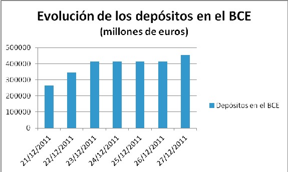 Por otra parte, al igual que las posiciones de solvencia de las entidades financieras europeas están comprometidas, el hecho de que el resto de agentes a quienes deberían prestar estos fondos no esté mejor –sobre todo los agentes que se suponía libres de riesgo: los Estados-, provoca que parte de la nueva financiación se mantenga líquida, de nuevo, en el BCE.