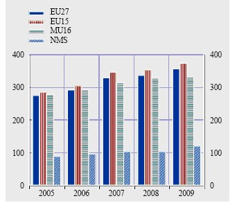 Fuente: informe del BCE EU Banking Structures de 2010. Nota: MU16 (Monteary Union), NMS (New Member States: Chipre, Letonia, Estonia, Polonia...)