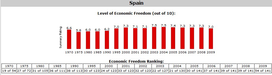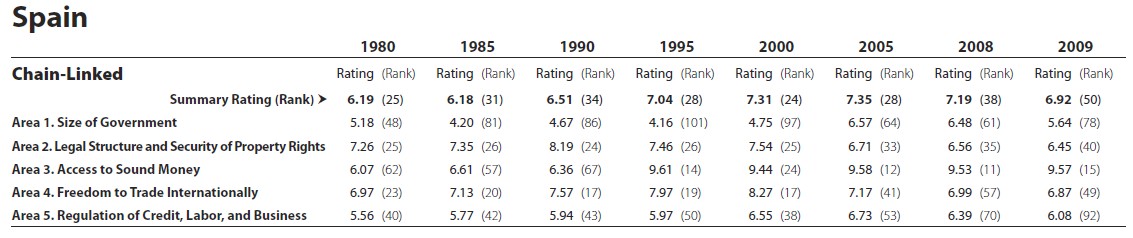 Según el último ranking de libertad económica que elabora el prestigioso Fraser Institute canadiense, España ocupó el puesto 54 del mundo, de un total de 141 países analizados. Una posición muy alejada de casi todos los grandes países de la UE, que se sitúan en los 30 primeros puestos. Tan sólo Italia, Portugal y Grecia están peor clasificados. De hecho, en el puesto 52 del ránking está Uganda, en el 55 Trinidad y Tobago, en el 56 Kazajstán y en el 57 Kenya.