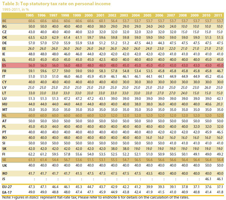 Tabla 1: En concreto, en España (ES, por su abreviatura en la siguiente tabla) el tipo impositivo máximo sobre la renta (top statutory tax rate on personal income, en inglés) se sitúa ahora en el 52%, a la altura de Holanda (NL) y tan sólo superado por Suecia (SE) y Bélgica (BE), con un 56,4% y un 53,7%, respectivamente, según los datos de la oficina estadística de la UE (Eurostat) correspondientes a 2011.