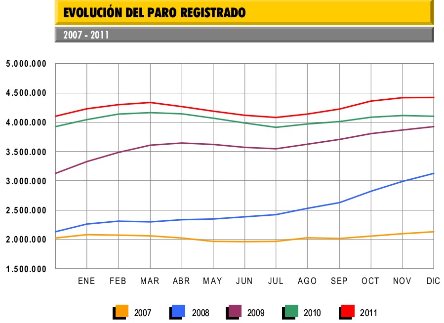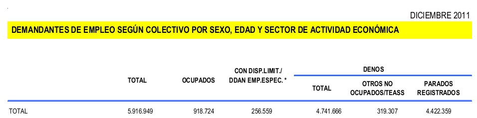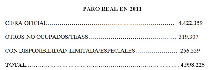De este modo, el número real de parados -sumando ambos epígrafes- asciende a un total de 4.998.225 el pasado diciembre, ocultándose así a casi 576.000 parados en las listas oficiales. Esto supone un aumento de casi 450.000 parados respecto al dato real de cierre de 2010.
