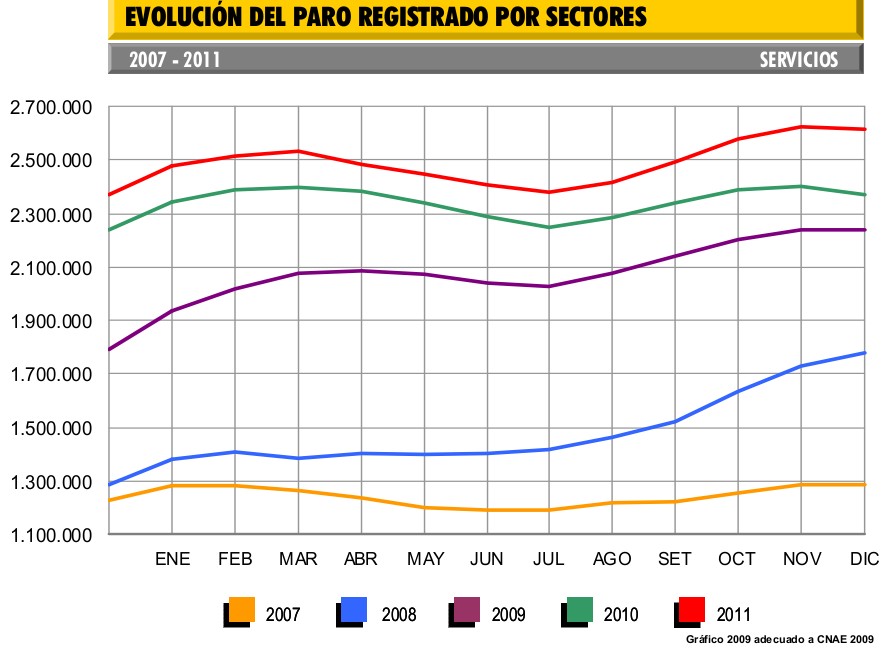 Por sectores, el paro subió en 2011 en todos ellos, especialmente en los servicios, con 240.590 desempleados más (+10,1%). En la construcción se registraron 22.861 parados más (+3%), en el colectivo sin empleo anterior el paro subió en 21.871 desempleados (+6,1%), en la agricultura repuntó en 19.132 personas (+15%) y en la industria aumentó en 17.832 desempleados (+3,6%).