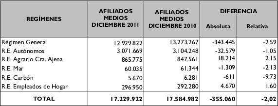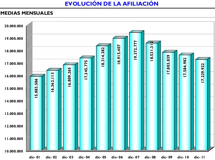 Por otro lado, la Seguridad Social cerró 2011 con un descenso medio de 355.060 afiliados (-2%), tras registrar en diciembre 18.609 cotizantes menos (-0,1%), su quinto descenso mensual consecutivo, situándose el total de ocupados al finalizar el ejercicio en 17.229.922, alcanzando su nivel más bajo desde 2003. El volumen de afiliación media a lo largo de todo 2011 (17.433.161 cotizantes) retrocede hasta niveles de 2004.