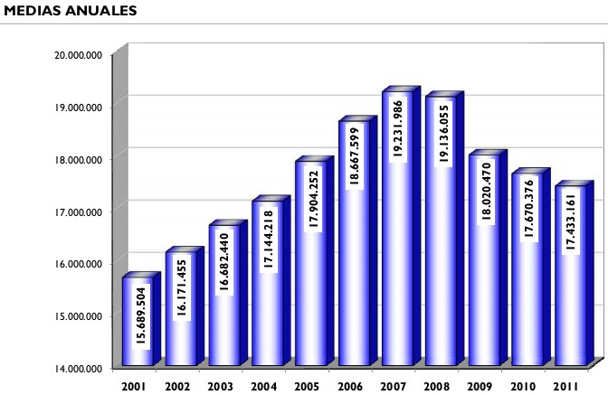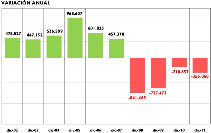 La pérdida de afiliados en 2011 supone la cuarta caída anual la ocupación y es superior a la registrada en 2010, cuando el sistema experimentó un descenso de cotizantes superior a las 218.000 personas. En 2008 y 2009, el sistema perdió 841.465 y 727.473 cotizantes, respectivamente.