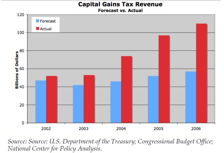 Son estimaciones que más de una vez no han sido refrendadas por la realidad, incluso cuando se redujeron los impuestos. De hecho, la reducción de la tributación de las ganancias de capital en Estados Unidos en 2003 es un ejemplo en el que los incrementos estimados de la recaudación por la reducción fiscal (columnas rojas) fueron mayores de la prevista (azules):