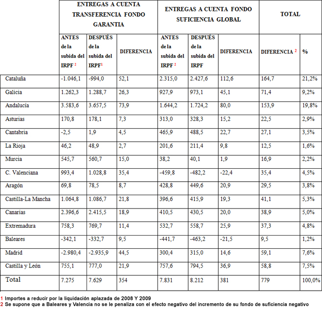 El reparto de estos fondos extra es muy diferente. Dicho aumento fiscal sólo incidirá positivamente en el cálculo del ITE (ingresos tributarios del estado) y, a través de este índice, en el fondo de suficiencia global que se reparte entre las autonomías. Además, un mayor ITE también tendrá efectos en la actualización de la aportación estatal al fondo de garantía de los servicios públicos fundamentales que, igualmente, se reparte entre las regiones. Posteriormente, en el ejercicio 2014, cuando se practique la liquidación del ejercicio 2012, también tendrá incidencia en la actualización de los fondos de convergencia autonómica.