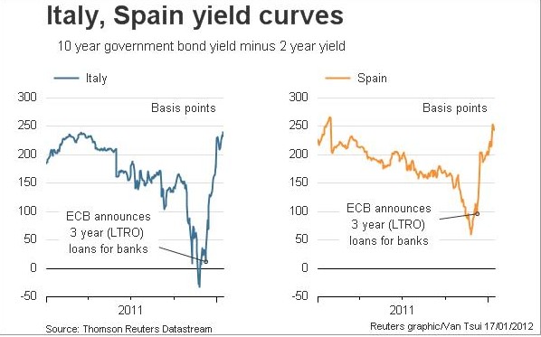 Y fue en diciembre, precisamente, cuando el Banco Central Europeo (BCE) anunció la reapertura de la liquidez ilimitada a la banca. Este nuevo balón de oxígeno es el que está inflando de forma artificial las subastas de España e Italia, según la mayoría de analistas. La entidad prestó a los grandes bancos comunitarios casi 500.000 millones de euros a tres años y a un tipo de interés del 1%.