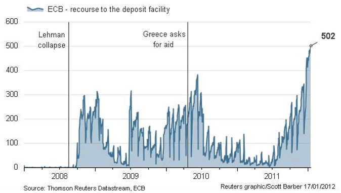 Así, los bancos de la zona euro depositaron el lunes en el BCE un total de 501.933 millones de euros, una cantidad que supone un nuevo máximo histórico como reflejo de la persistente desconfianza entre las entidades, que prefieren salvaguardar sus recursos en la hucha de la institución emisora antes que buscar mayores rendimientos mediante inversiones y la concesión de préstamos.