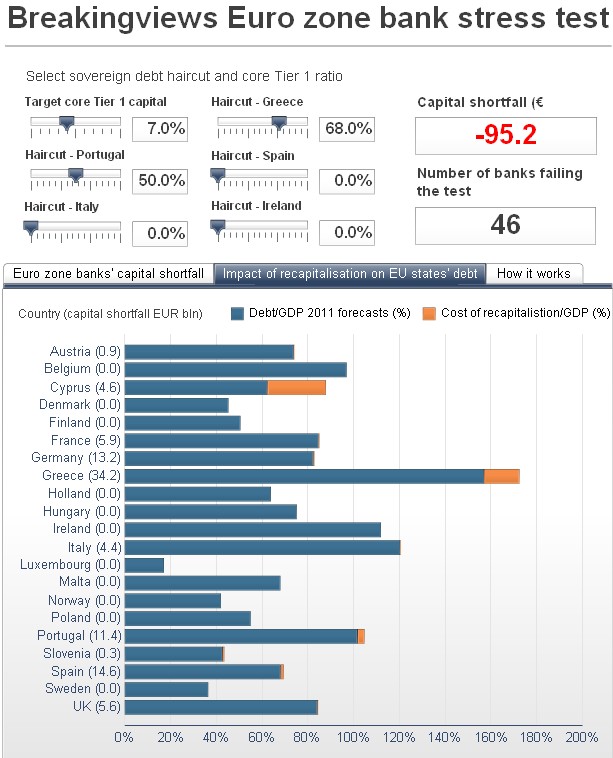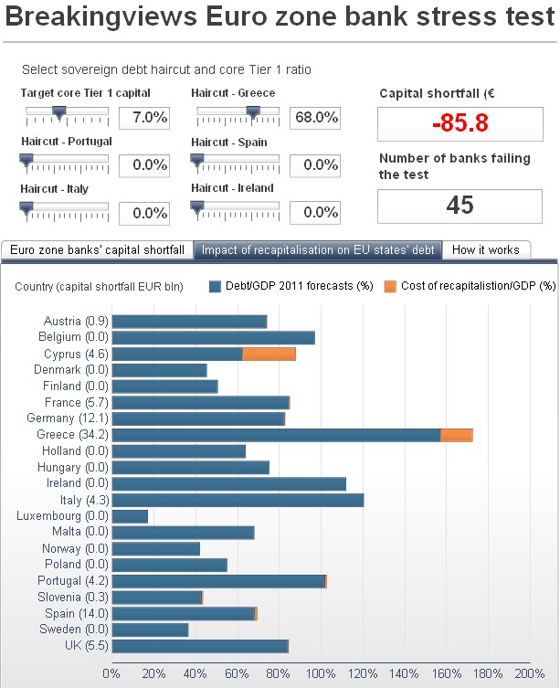 Así, según las estimaciones elaboradas por Reuters, una quita del 68% sobre la deuda pública helena causará unas pérdidas próximas a los 86.000 millones de euros a la banca, de forma que 45 entidades financieras comunitarias no alcanzarían el umbral del 7% de capital básico requerido.