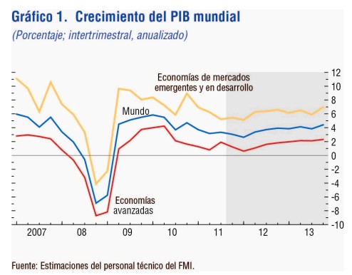 Dicha alerta se recoge expresamente en el informe del FMI, bajo el título La recuperación mundial se estanca, los riesgos a la baja se intensifican. Efectivamente, según los analistas del ente, el PIB mundial crecerá un 3,3% en 2012 si, y sólo si, los países del euro adoptan las particulares recomendaciones del Fondo, algo que "en ningún caso" está garantizado, alertaba Lagarde.