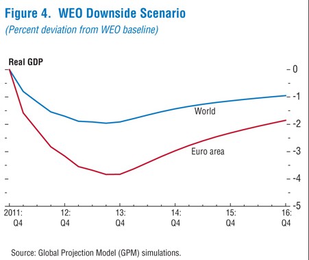 Como resultado, el FMI estima que el PIB mundial cae un 1,75% en 2012 en comparación con su escenario base, mientras que la economía de la eurozona se contrae casi un 4%. Así, el contagio financiero al resto del mundo sería mucho más intenso que en su escenario base, aunque "menor que el observado tras el colapso de Lehman Brothers en 2008".