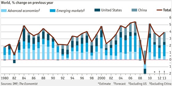 El organismo prevé el siguiente escenario base: la economía mundial crecerá un 3,3% en 2012 y un 3,9% en 2013, lo que supone una revisión a la baja de 0,7 y 0,6 puntos, respectivamente, en comparación con su informe del pasado septiembre. En concreto, las economías avanzadas apenas crecerán un 1,2% en 2012 y un 1,9% en 2013 mientras que las emergentes se desaceleran ligeramente hasta un 5,4% y 5,9%. Mientras, cree que EEUU, la primera economía mundial, se expandirá un 1,8% en 2012 y un 2,2% en 2013.
