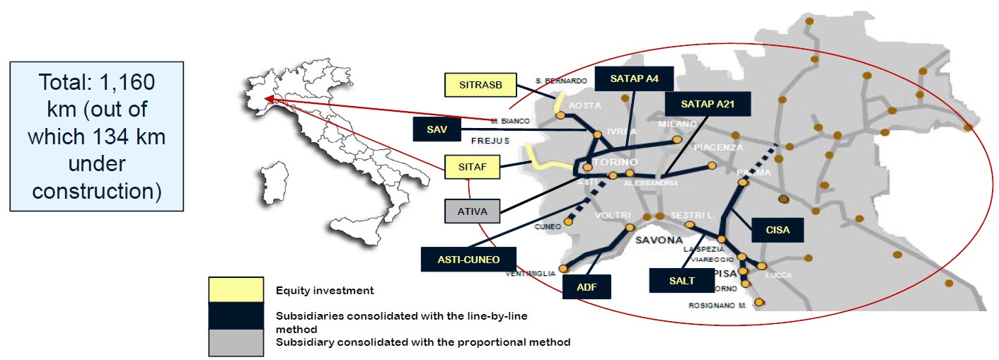 Como su nombre indica, se trata de un grupo consolidado dedicado a la explotación de concesiones de autopistas. Cuenta con una red de comunicación de 1.160 kilómetros en el motor económico de Italia. Principalmente, el área que une el Piamonte con la Lombardía, complementando su área de negocio en Chile y Gran Bretaña con otros 273 kilómetros.